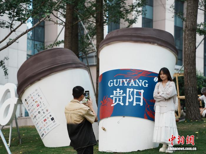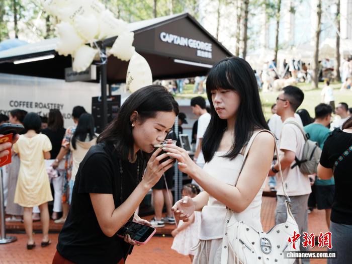 8月17日,贵州省贵阳市不雅山湖区,公众正在咖啡散市下品尝采办的咖啡。中新社记者 周燕玲 摄
