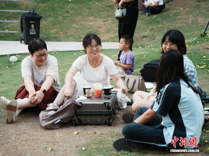 8月17日,贵州省贵阳市不雅山湖区,旅客正在咖啡散市旁的草坪上喝咖啡谈天。中新社记者 周燕玲 摄