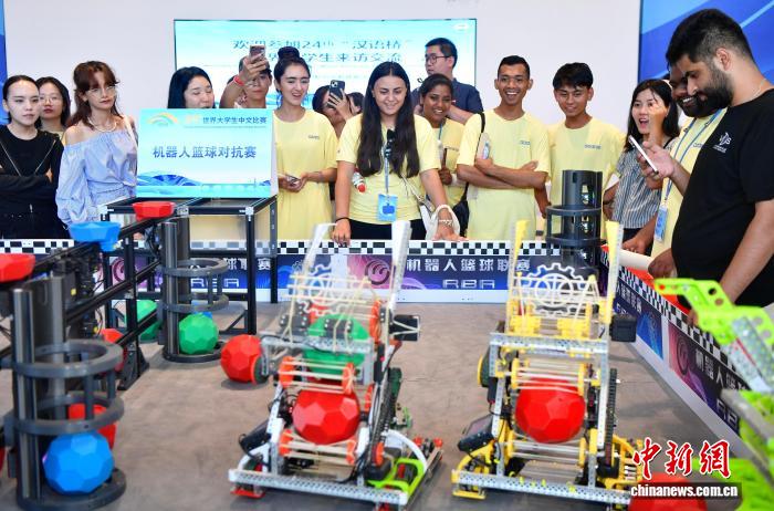 8月17日,参与第两104届“汉语桥”寰球年夜教死华文角逐环球绝赛,去自举世100多个邦家的125实选脚走入祸州年夜教观光交换。图为呆板人篮球顽抗赛吸收中邦年夜教死观光履历。中新社记者 弛斌 摄
