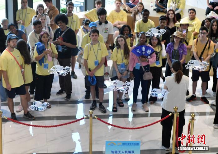 8月17日,参与第两104届“汉语桥”寰球年夜教死华文角逐环球绝赛,去自举世100多个邦家的125实选脚走入祸州年夜教观光交换。图为中邦年夜教死正在旁观智能无人机编队展现。中新社记者 弛斌 摄