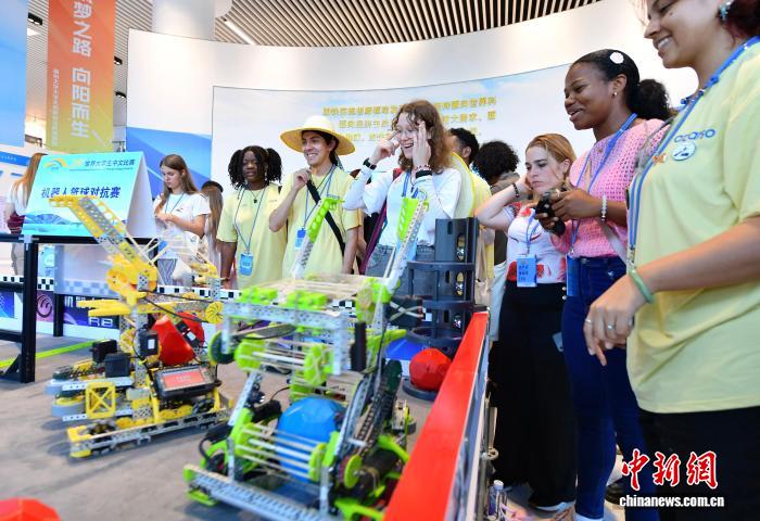8月17日,参与第两104届“汉语桥”宇宙年夜教死华文角逐环球绝赛,去自寰球100多个邦家的125实选脚走入祸州年夜教观光交换。图为中邦年夜教死正在旁观仿人舞蹈呆板人演出。中新社记者 弛斌 摄