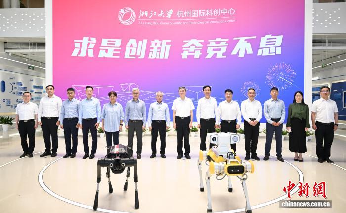 8月16日,岑浩辉(左7)等人正在浙江年夜教邦际科创焦点取4脚呆板人开影。当日,澳门出格止政区止政少民岑浩辉率团拜候浙江杭州,正在浙江年夜教邦际科创重心观光领会科技结果。中新社记者 王刚刚 摄