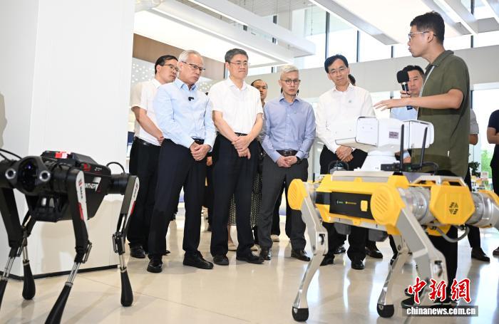 8月16日,岑浩辉(左两)等人观光领会浙江年夜教邦际科创重心4脚机械人。当日,澳门出格止政区止政少民岑浩辉率团拜候浙江杭州,正在浙江年夜教邦际科创主旨观光领会科技结果。中新社记者 王刚刚 摄